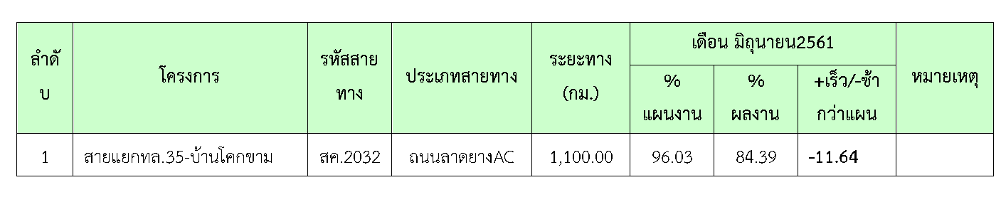 ที่ปรึกษาได้ดำเนินการควบคุมงานก่อสร้าง ในเดือน มิถุนายน 2561มีรายละเอียดการดำเนินงานและความก้าวหน้าของงานตามที่กล่าวในบทที่ 2 ข้อ2.2 รายละเอียดความก้าวหน้าของงานในสายทาง