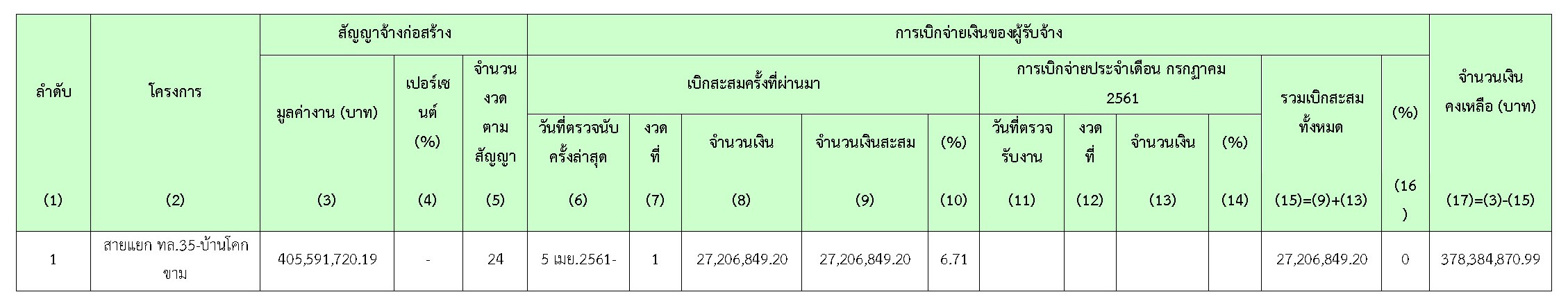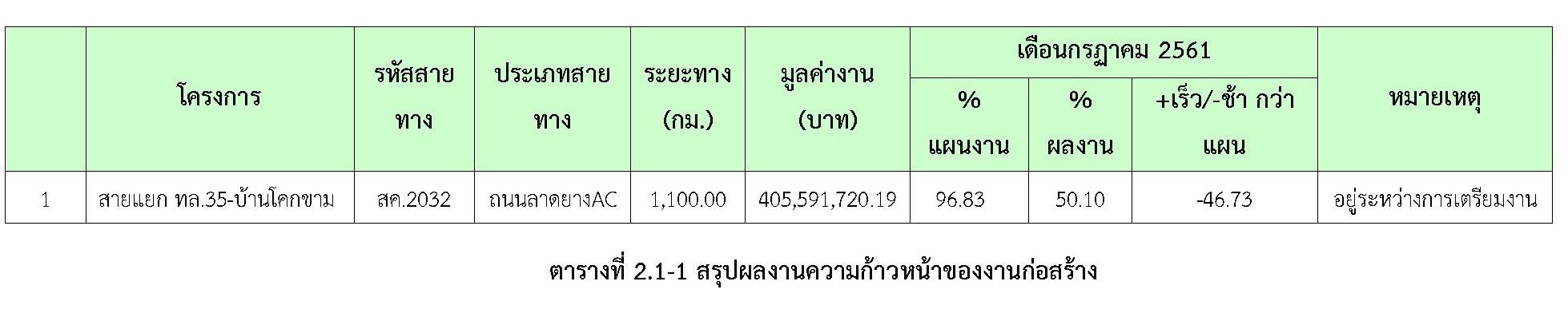 ในเดือน กรกฏาคม 2561มีความก้าวหน้าของงานก่อสร้างที่สามารถตรวจรับงานได้ ดังสรุปในตารางที่ 2.3-1