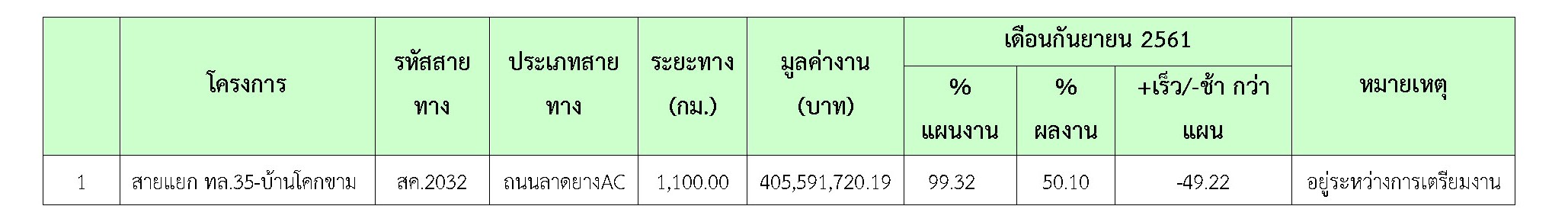 ความก้าวหน้าของเดือน กันยายน 2561ของการปฏิบัติงาน (50.10%) แยกเป็น ดังต่อไปนี้