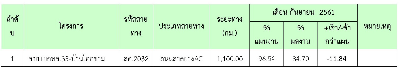 ที่ปรึกษาได้ดำเนินการควบคุมงานก่อสร้าง ในเดือน กันยายน 2561มีรายละเอียดการดำเนินงานและความก้าวหน้าของงานตามที่กล่าวในบทที่ 2 ข้อ2.2 รายละเอียดความก้าวหน้าของงานในสายทาง