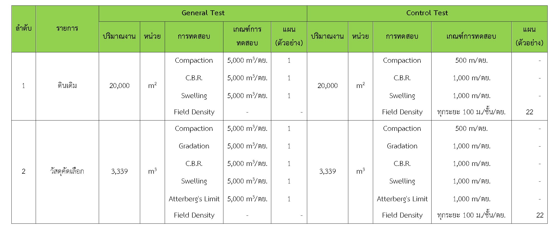 ในเดือน กันยายน 2561ได้แสดงเกณฑ์การทดสอบ General Test และ Control Test แสดงไว้ในตารางที่ 3.2-1 – 3.2-3 ดังนี้