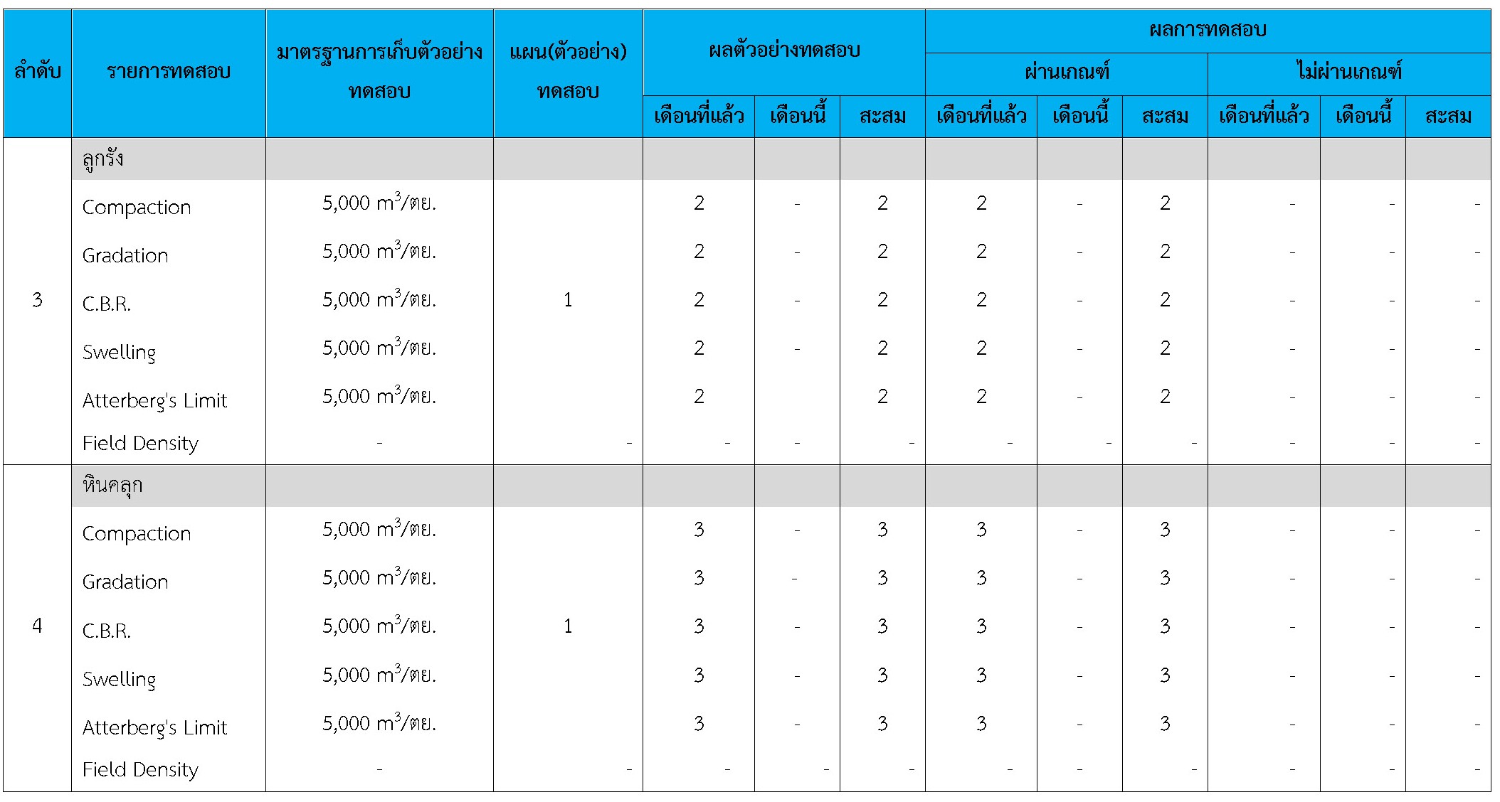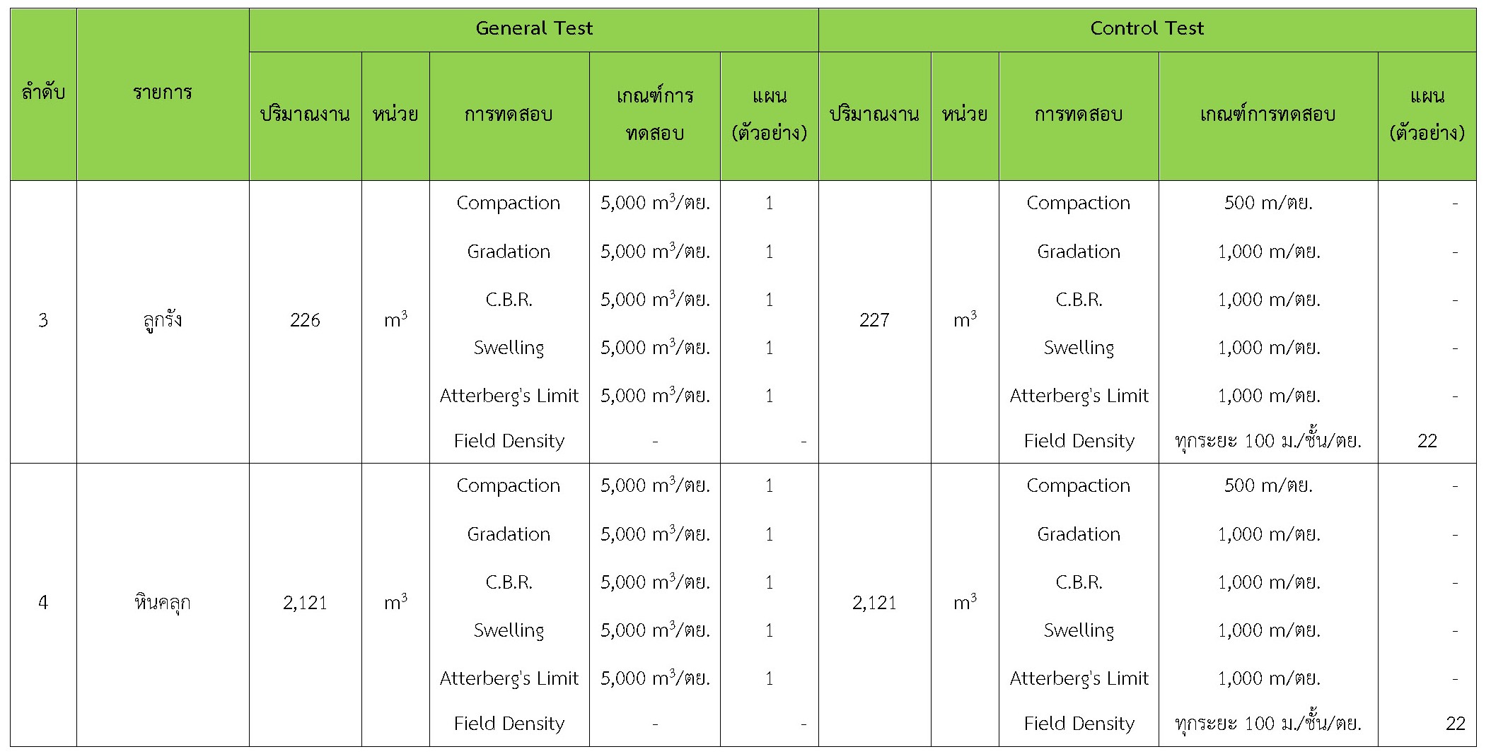 ในระหว่างวันที่ 1- 30 ตุลาคม 2561ผู้ว่าจ้างได้เสนอหนังสือขออนุมัติใช้วัสดุถึงที่ปรึกษา โดยที่ปรึกษาได้ตรวจสอบวัสดุดังกล่าวมีผลทดสอบดังตาราง