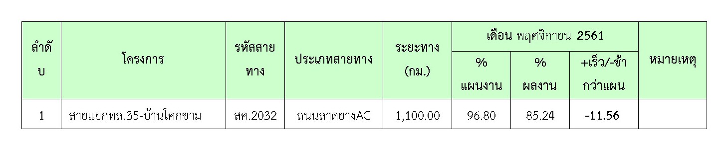 ที่ปรึกษาได้ดำเนินการควบคุมงานก่อสร้าง ในเดือน พฤศจิกายน 2561มีรายละเอียดการดำเนินงานและความก้าวหน้าของงานตามที่กล่าวในบทที่ 2 ข้อ2.2 รายละเอียดความก้าวหน้าของงานในสายทาง