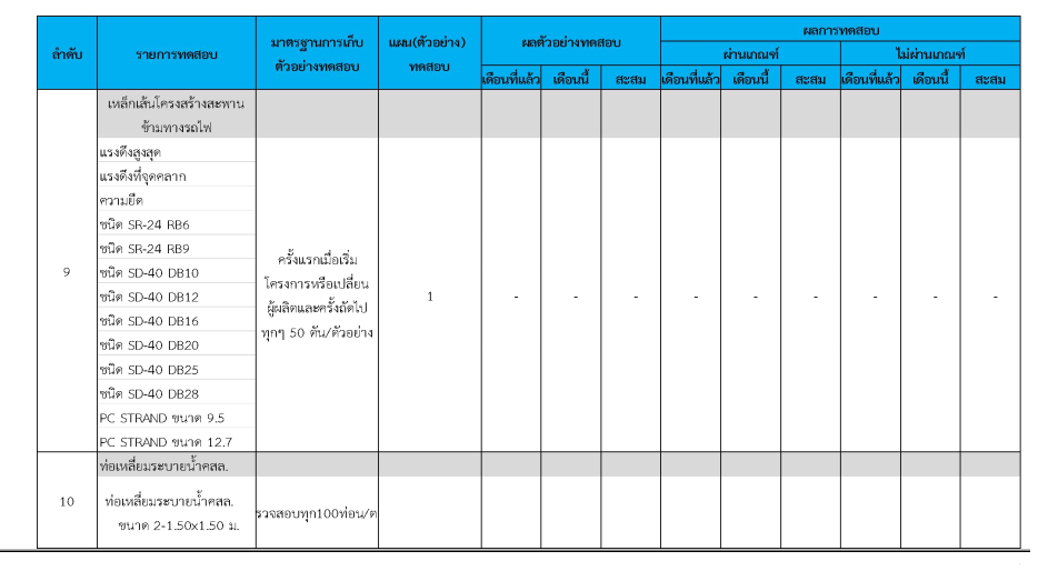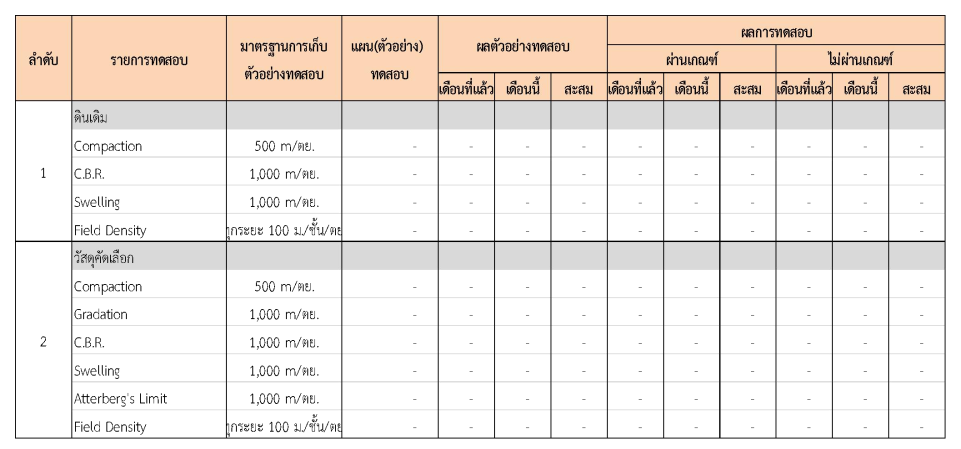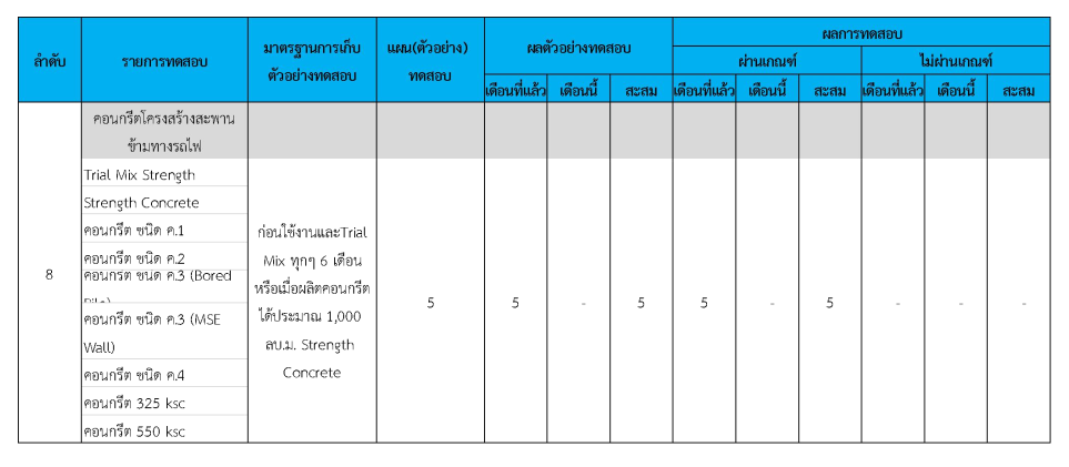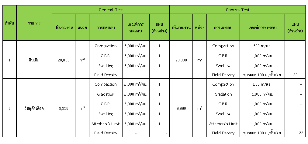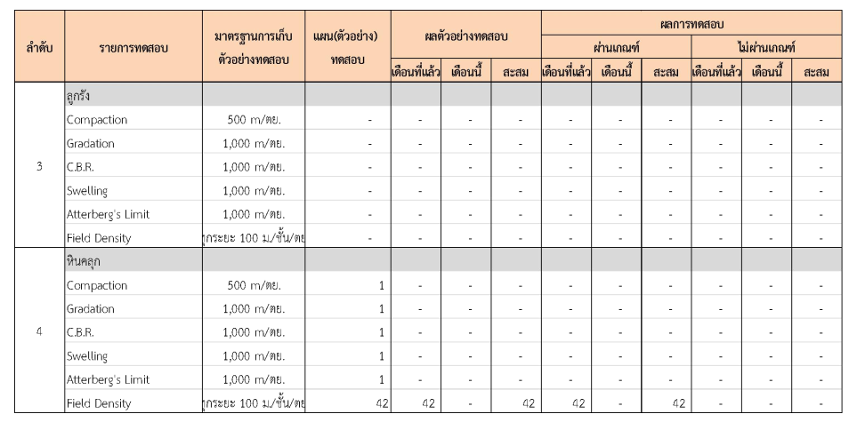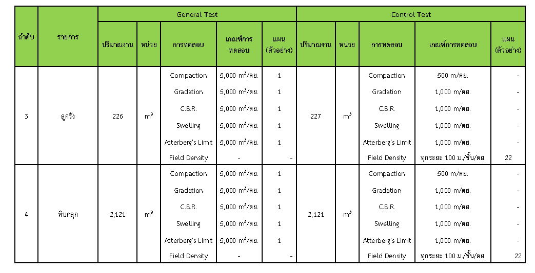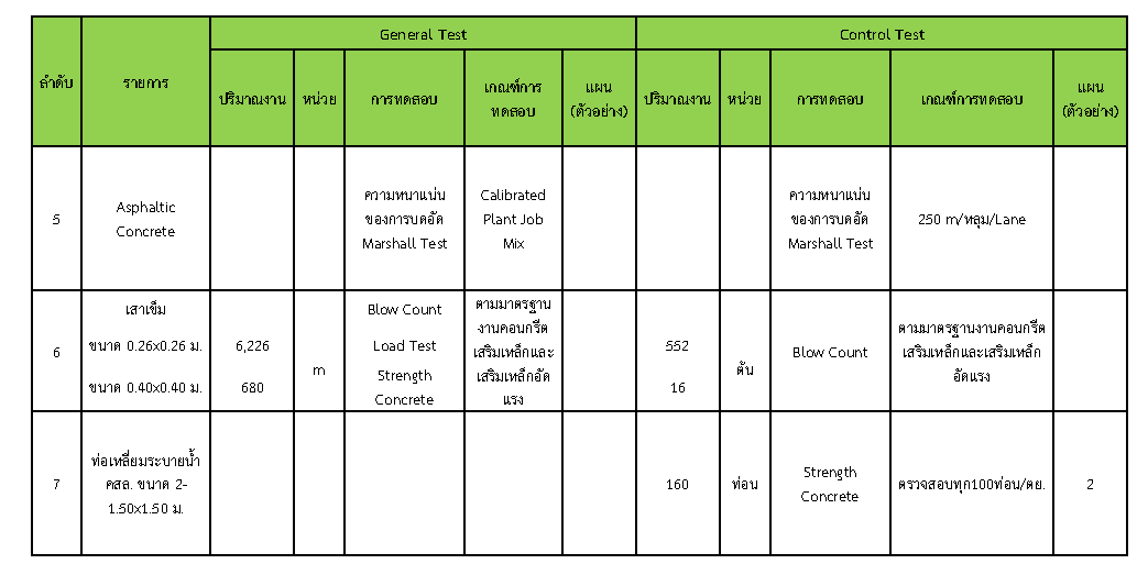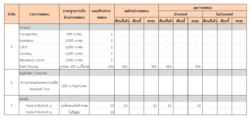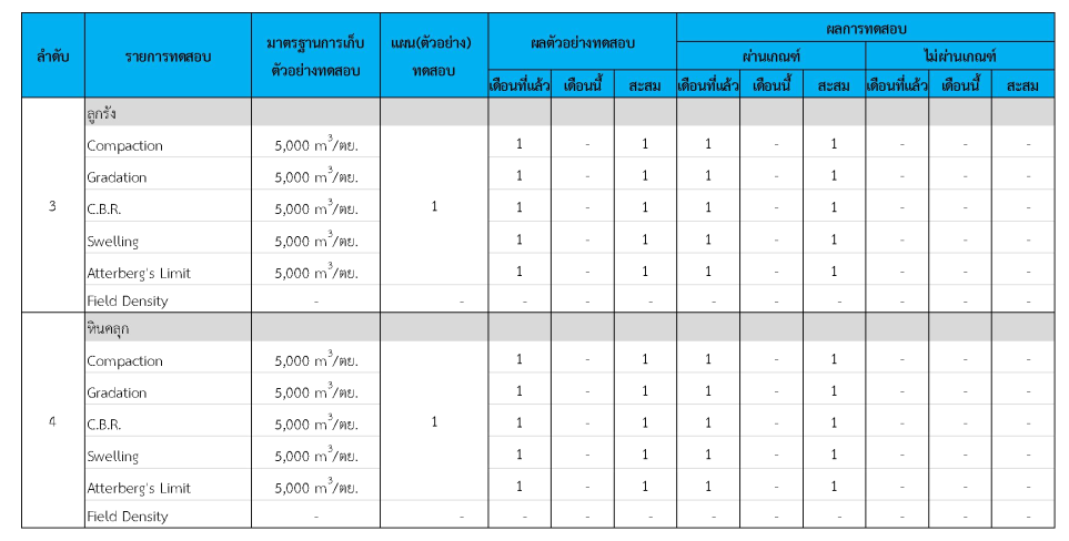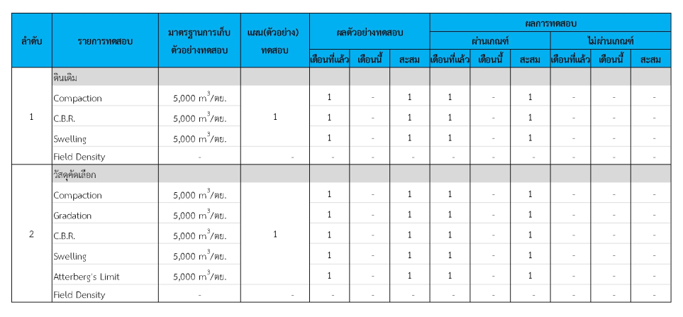 ในระหว่างวันที่ 1-31 มีนาคม 2562 ผู้ว่าจ้างได้เสนอหนังสือขออนุมัติใช้วัสดุถึงที่ปรึกษา โดยที่ปรึกษาได้ตรวจสอบวัสดุดังกล่าวมีผลทดสอบดังตาราง