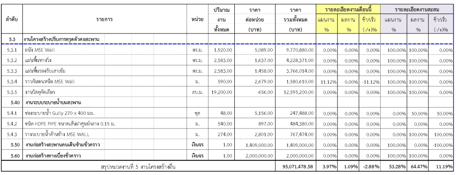 ในเดือน สิงหาคม 2562 มีความก้าวหน้าของงานก่อสร้างที่สามารถตรวจรับงานได้ ดังสรุปในตารางที่ 2.3-1