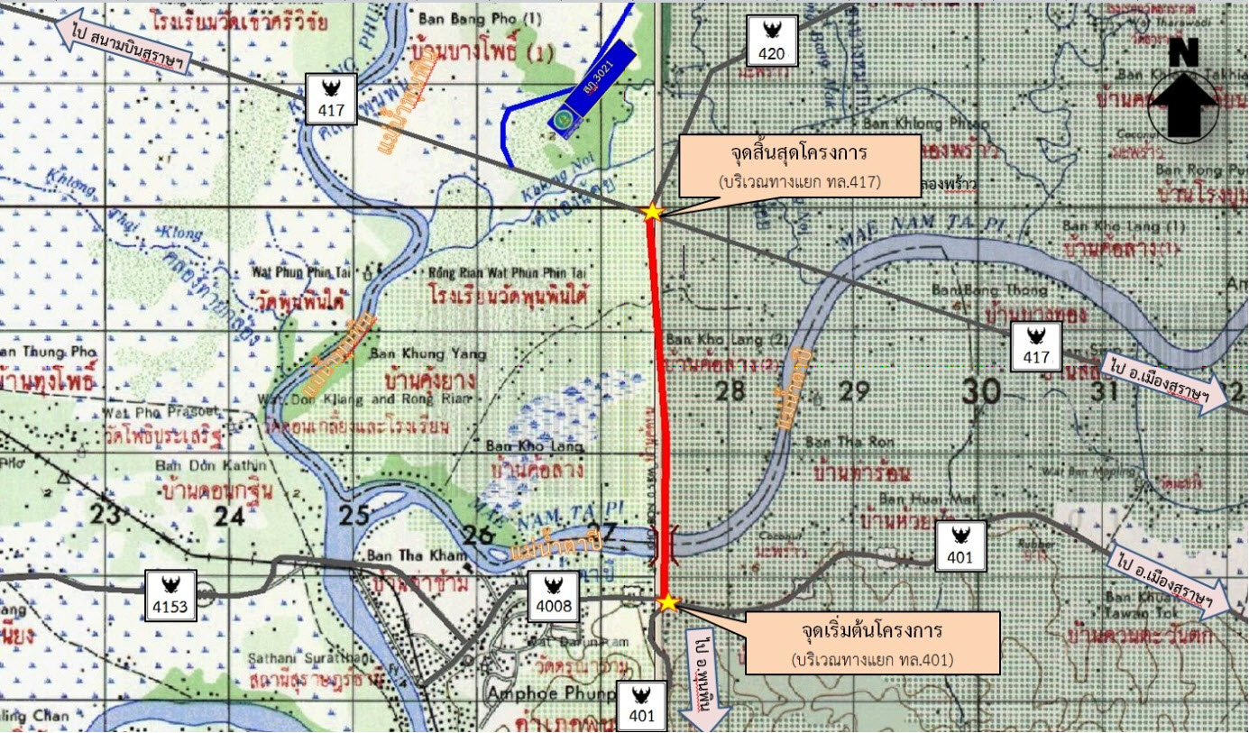 สภาพปัจจุบันของบริเวณโครงการมีโครงข่ายเชื่อมต่อกับถนนโครงการสำรวจออกแบบ ถนนสายแยก ทล.401 – แยก ทล.417 ตำบลท่าข้าม, คลองน้อย อำเภอพุนพิน จังหวัดสุราษฎร์ธานี